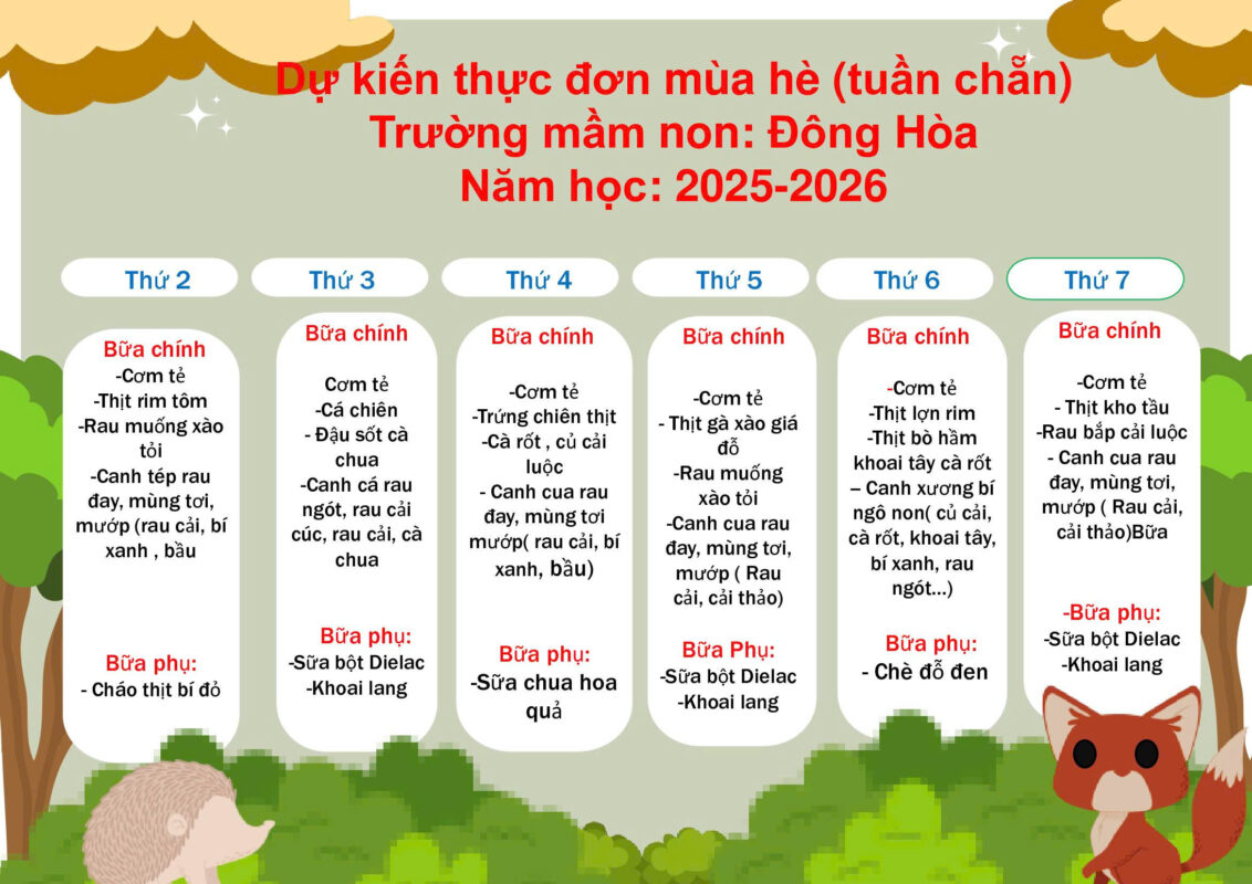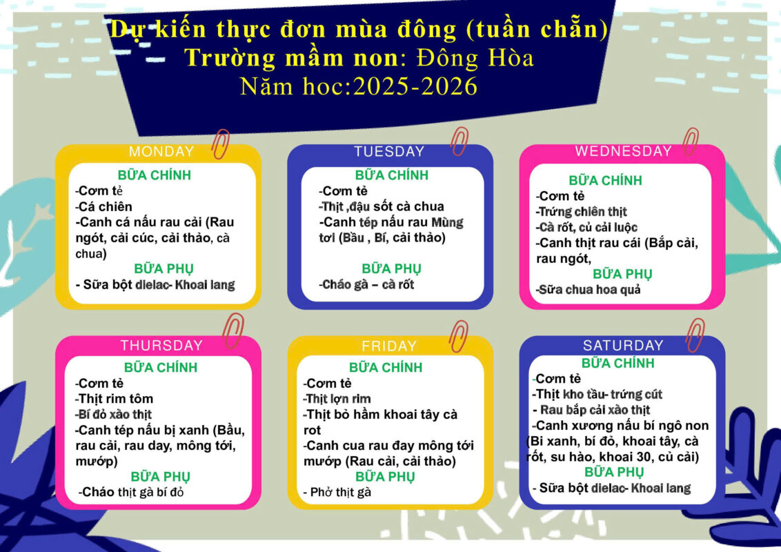 Thực đơn của các bé trường mầm non Đông Hòa Phường Trà Lý- Tỉnh Hưng Yên